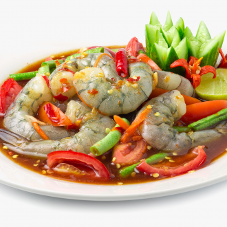 ยำกุ้งสด รสแซ่บเครื่องแน่น รสเผ็ดจัดจ้าน ใช้กุ้งตัวใหญ่ สด เนื้อแน่นเต็มคำ